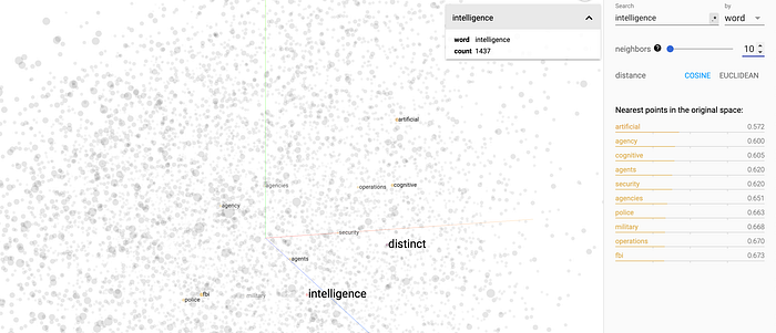 On projector.tensorflow.org, you can see a visual representation of this map of words. Each grey point represents a word embedded in a three-dimensional space with all the other words in that vocabulary.