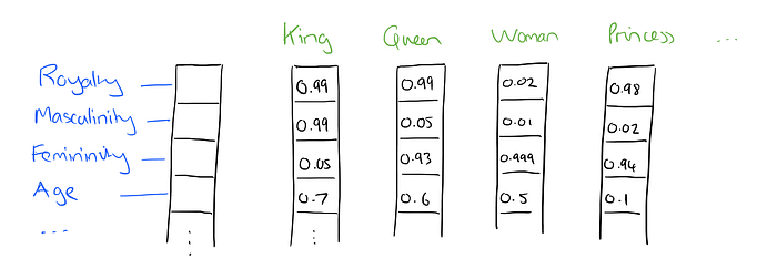 For example, a word vector for the word “queen” might have high values for dimensions representing “femininity” and “royalty” and low values for dimensions representing “masculinity.”