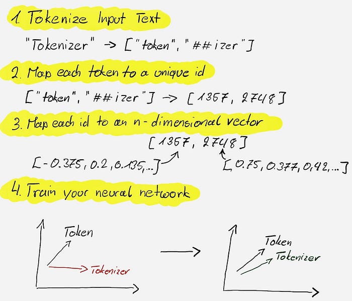 To get to a point where your model can understand text, you first have to tokenize it, vectorize it and create embeddings from these vectors.